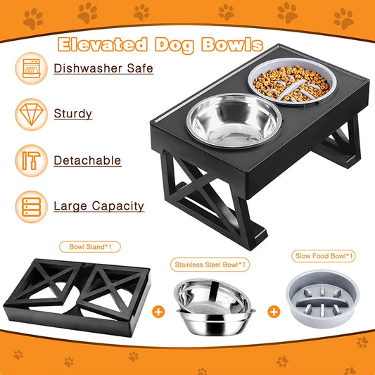 Kimpets Dogs Double Bowls Stand 3 Adjustable Height Pet Slow Feeding Dish Bowl Medium Big Dog Elevated Food Water Feeders Table